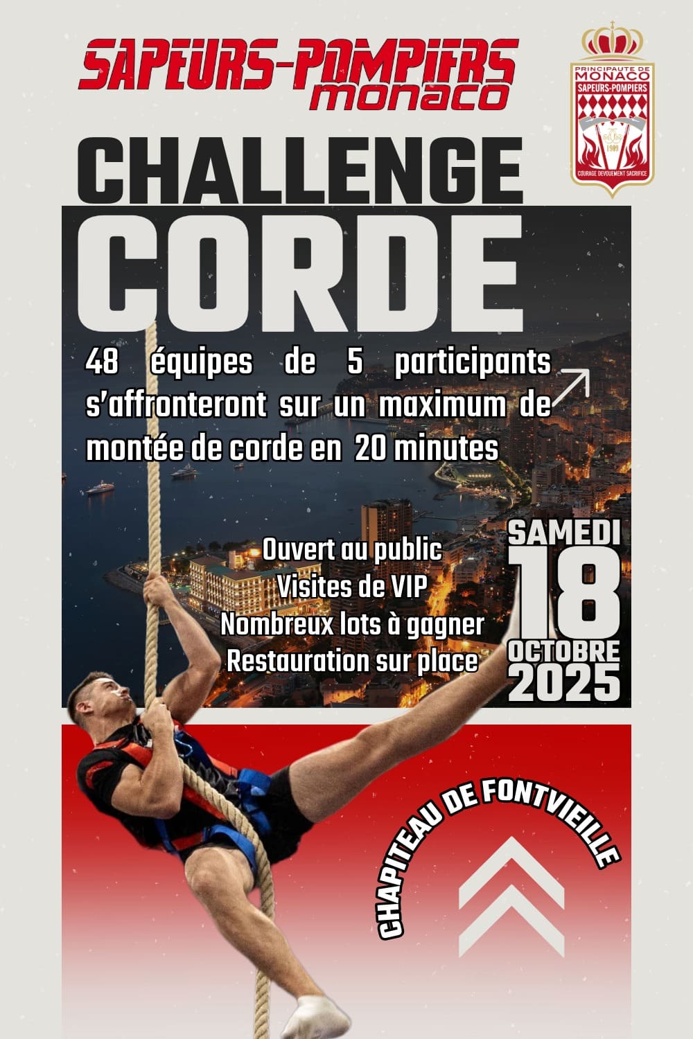 28 squadre provenienti da tutta la Francia e da Monaco si riuniscono sotto il tendone dell’Espace Fontvieille per partecipare al 2° Challenge Corda organizzato dal Corpo dei Vigili del Fuoco di Monaco.